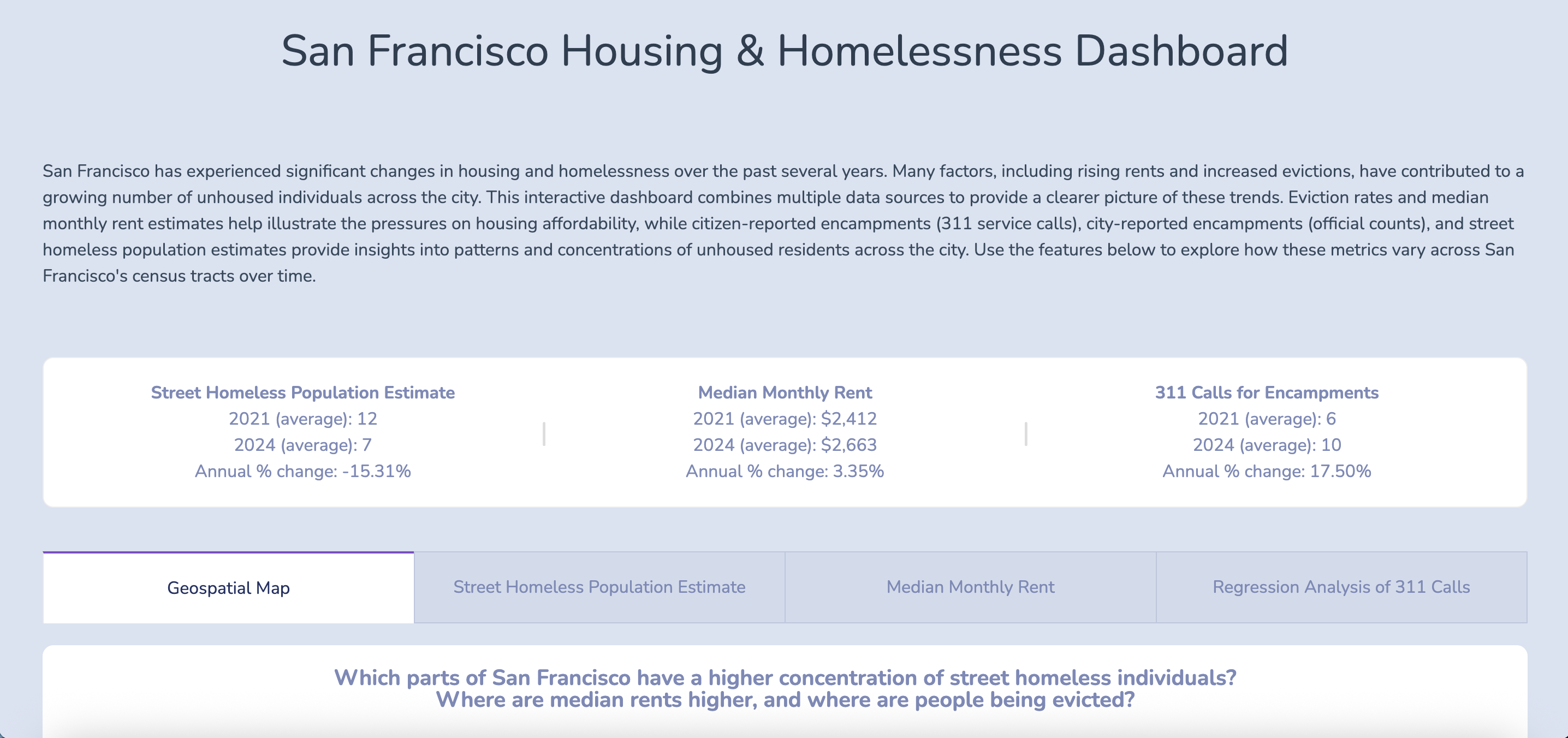 Using multipliers from the literature applied to encampment counts, we generated tract-level estimates of the street homeless population. These estimates and metrics were integrated into an interactive dashboard featuring: (1) a choropleth map showing metrics by tract and month; (2) line graphs of street homelessness and the distribution of tents, structures, and vehicles for a selected census tract; (3) a line graph of monthly median rent that updates by ZIP code; and (4) a regression analysis linking 311 calls to tract-level characteristics.
