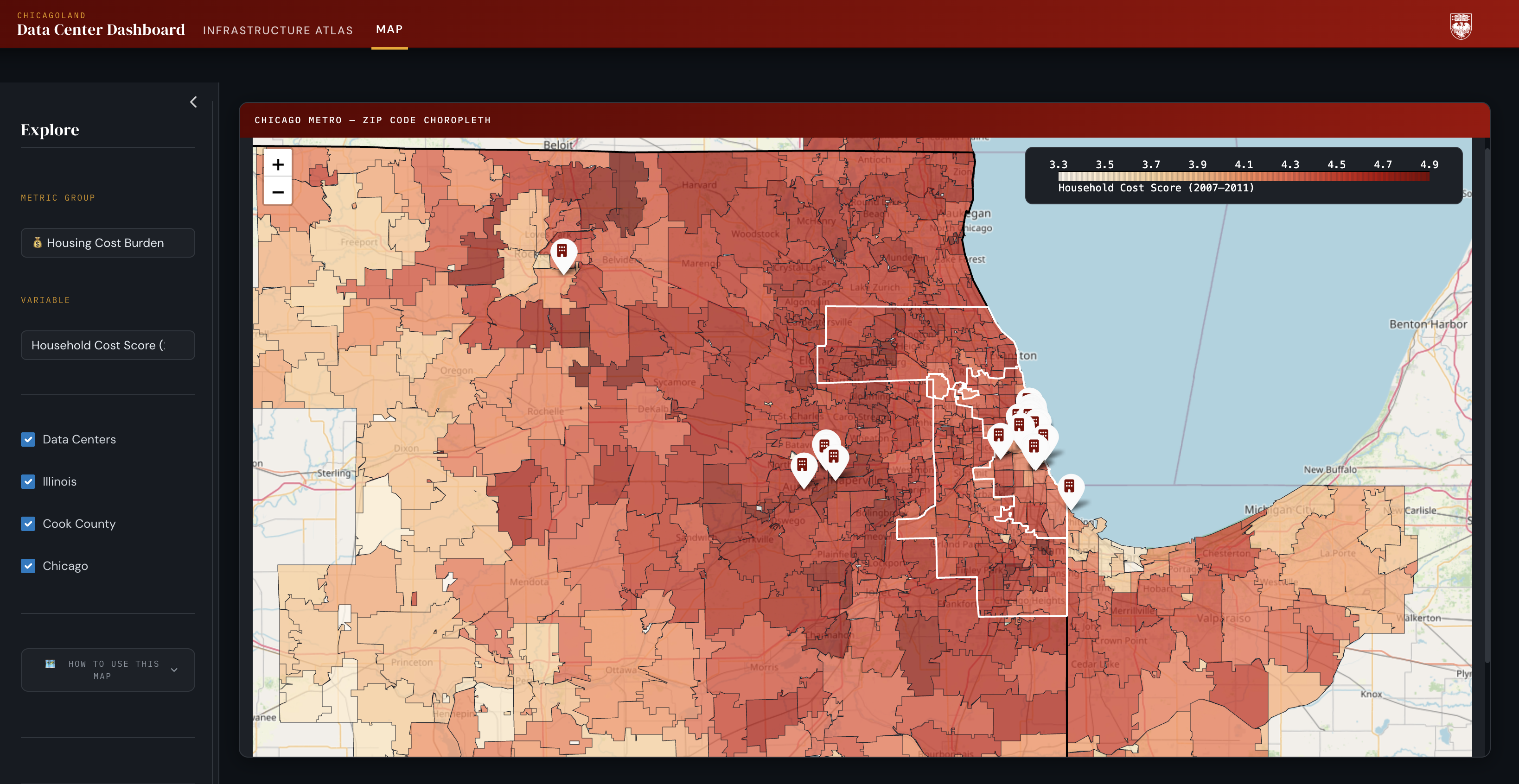 Data Centers Next Door analyzes how the development of data centers may affect housing conditions in the Chicagoland area. The project combines datasets on data center locations, housing prices, and housing cost indicators to examine changes before and after facilities receive operating permits. Using a reproducible data pipeline and interactive visualizations, the analysis explores whether communities near data centers experience shifts in housing prices or affordability.